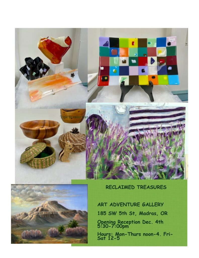 November & December’s show, “Reclaimed Treasures” at Art Adventure Gallery, is thanks to the generous donations of artists, craftspersons and other supporters of Jefferson County Art Association. We will be offering these beautiful pieces of Fused Glass, Pottery, Woodworking, Sculpture & Paintings at prices that are so affordable that it will make shopping locally a Christmas gift to everyone! Proceeds from this show will help us continue the mission of this important organization.