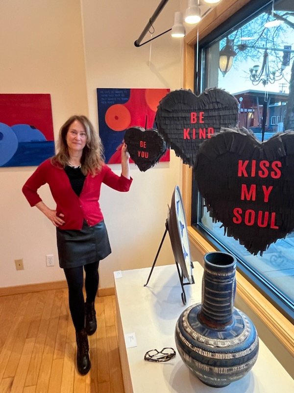 My solo exhibition, This Is Not A Love Story, features mixed-media and acrylic paintings, including my Vessel series of 18 paintings created between 2004 and the present, each incorporating words about relationships. In consideration of Madras’s diverse population, I hand-made piñatas and integrated beadwork into paintings, honoring these practices as both art forms and powerful means of storytelling.