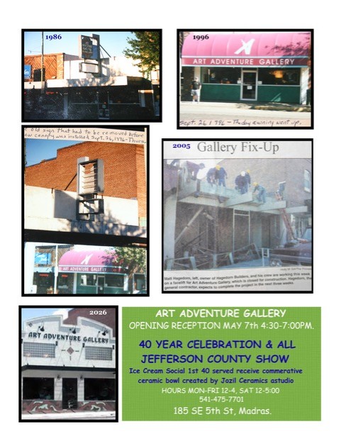 Art Adventure gallery was established in 1986 by a handful of people in a vacant building that had formerly housed a restaurant. As their vision for the community broadened, a new corporation was formed as JeffersonCounty Arts Association and in 2001 501c-3 non-profit status was achieved. This enabled the organization to survive on gallery sales, memberships and grants secured in furtherance of their mission. That mission is to celebrate the arts, provide a venue for exchange of ideas and self-expression and the opportunity to see the richness found in our cultural diversity, which is primarily Hispanic, Caucasian and the Confederated Tribes of Warm Springs. The goal is to educate in the mechanics of making art and to be its staunch advocate in all its many forms.